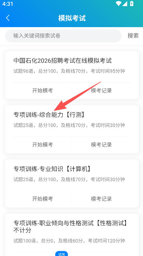 2、在模拟考试页面,选择对应专项训练,点击开始模考启动练习。
