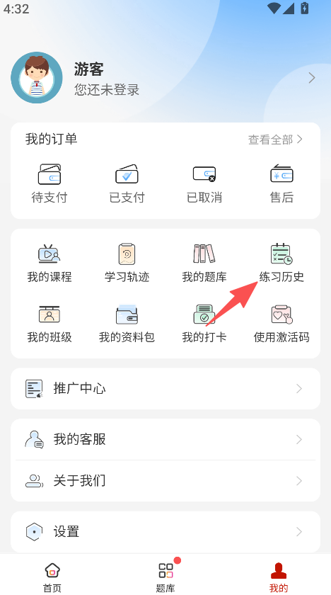 3、进入我的板块,点击练习历史,查看过往备考练习记录。