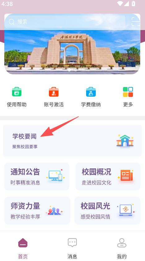 1、打开软件,进入首页,点击学校要闻板块。