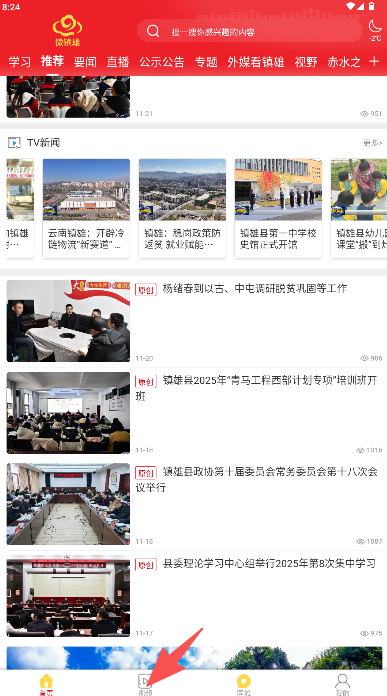 1、在首页浏览新闻后点击底部导航栏的“电视”按钮。