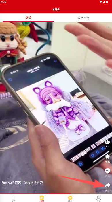 2、选择感兴趣的视频内容进入播放页点击分享图标。