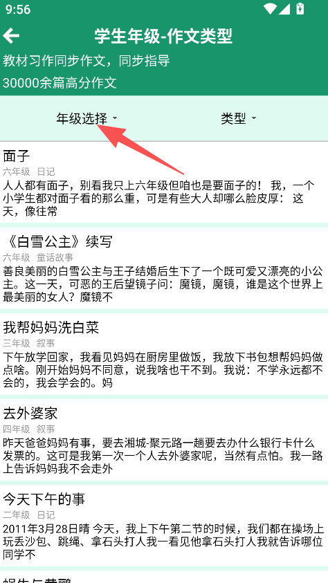 2、设置年级选择与类型选择功能,可按需选定对应年级与作文类型,精准筛选所需作文内容,提升内容获取效率。