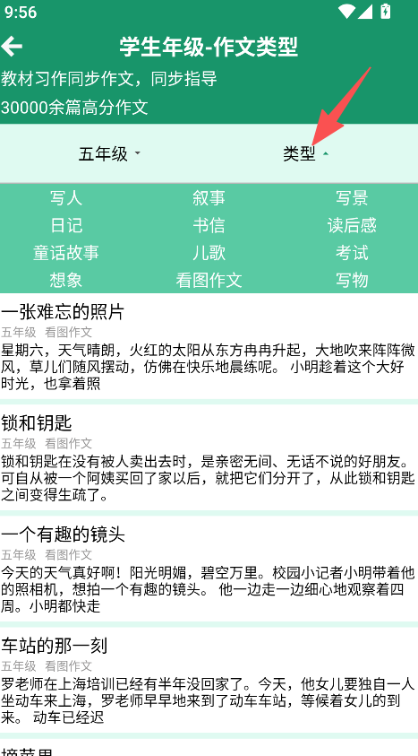 2、具备类型选择功能,展开类型选项后,可选定写人叙事等作文类型,缩小作文内容的筛选范围。