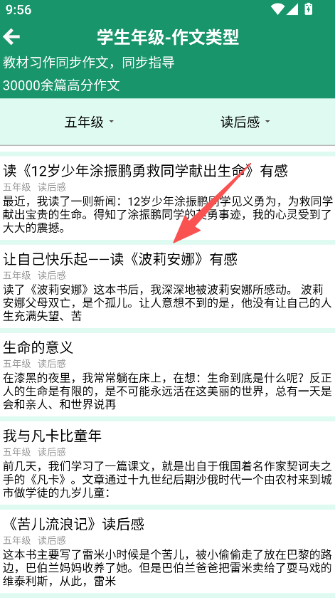 3、选定类型后查看页面展示的对应作文内容,获取作文参考资料。