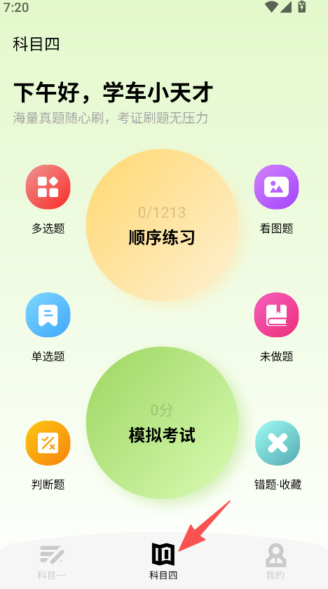 1、聚焦驾照理论学习,覆盖科目四板块,设顺序练习模拟考试功能,匹配理论备考的核心需求。