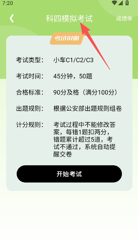2、支持模拟考试功能,查看考试说明后点击开始考试,参与贴合实际规则的理论模拟答题。