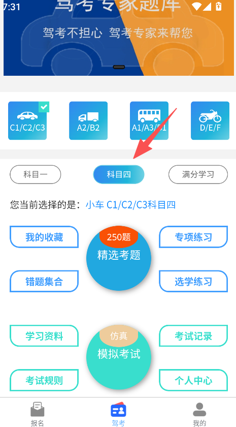 1、打开拓客学车选择对应车型,点击科目四进入该板块。