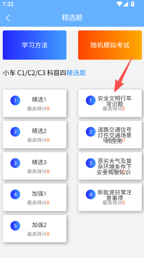 2、精选考题分学习方法与随机模拟考试,涵盖安全文明行车等知识点,精准划分学习内容,提升备考针对性。
