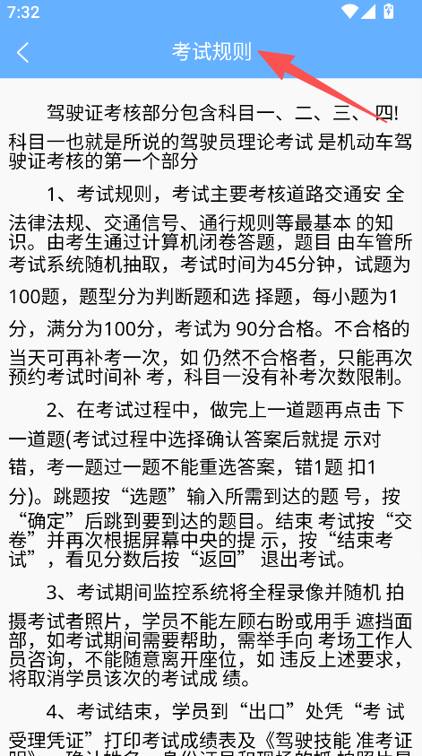 3、具备考试规则查看功能,点击考试规则,获取驾照考试的考核内容、流程及注意事项。