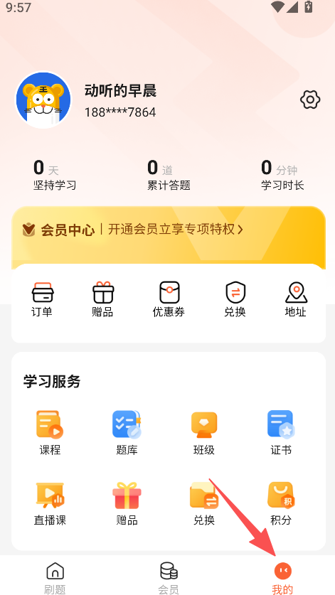1、点击我的,进入我的页面查看学习数据及功能选项。