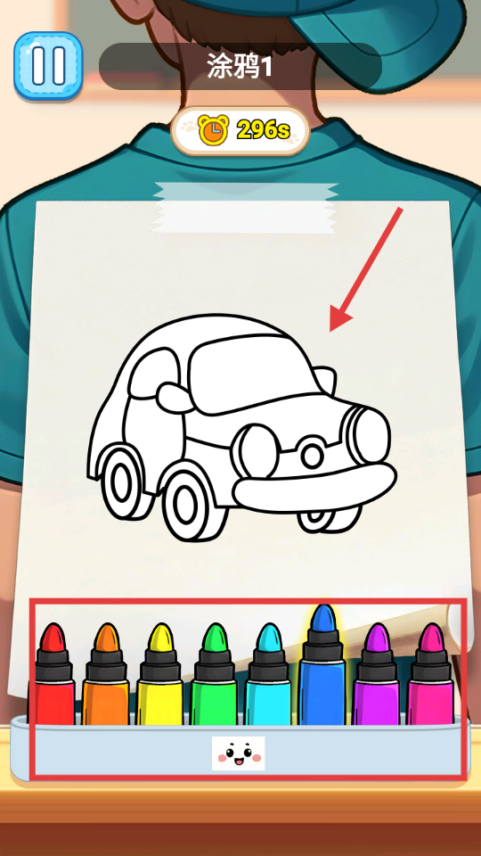 3、进入“涂鸦1”后,用下方红、橙、黄、绿等彩色画笔,为汽车线稿涂色。