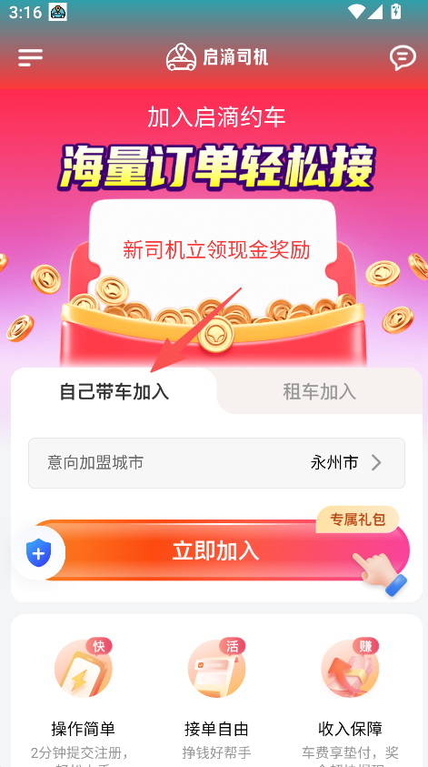 1、提供两种加入方式,自己带车或租车加入,灵活适配不同司机的车辆持有情况。