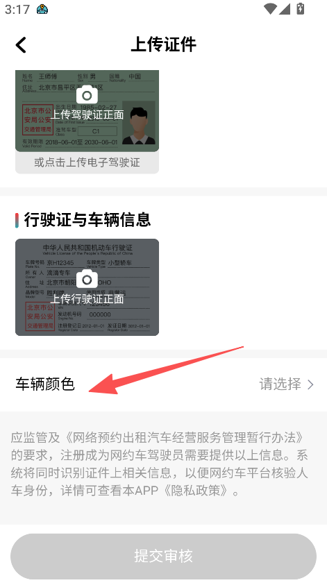 3、提供证件上传功能,可提交驾驶证行驶证等资料并提交审核等待通过。