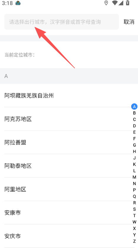1、支持出行城市选择功能,可通过汉字拼音或首字母查询并选定对应的目标出行城市。