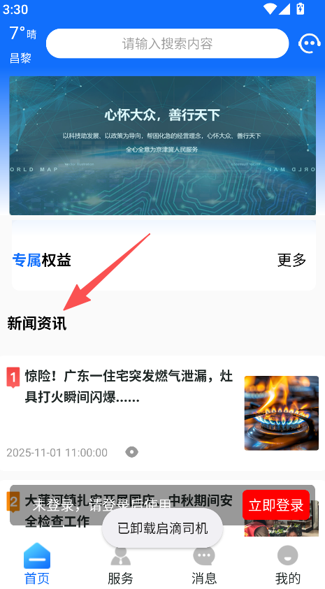 《昌黎市民通》是一款服务昌黎市民的综合类软件,设有搜索功能可输入内容查找信息,包含专属权益板块及新闻资讯板块,新闻资讯涵盖燃气安全事件、燃气行业新动态等实用内容,还划分首页、服务、消息、我的等功能板块,助力市民获取生活信息,了解安全知识及行业动态,满足日常信息查询与服务使用的多元需求。