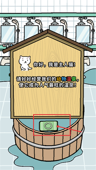 1、在【动物温泉】初始界面,点击被框选的按钮关闭提示,开启温泉经营流程,目标是提升温泉人气。