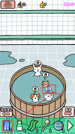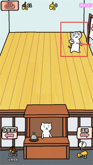 2、前台场景中,点击被框选的动物顾客,引导其进入温泉区域,当前橡果数为11,评价为57。