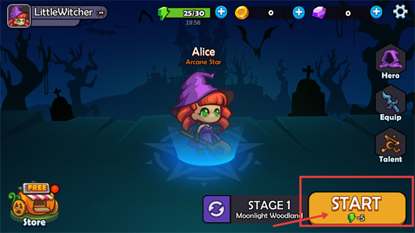 1、在主界面点击被框选的【START】按钮,消耗5点体力进入【STAGE1-Moonlight-Woodland】关卡,开启女巫冒险挑战。