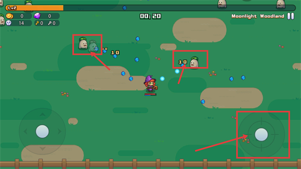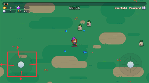 2、关卡中通过被框选的方向按钮操控女巫移动,在场景中躲避怪物,同时推进生存时间的积累。