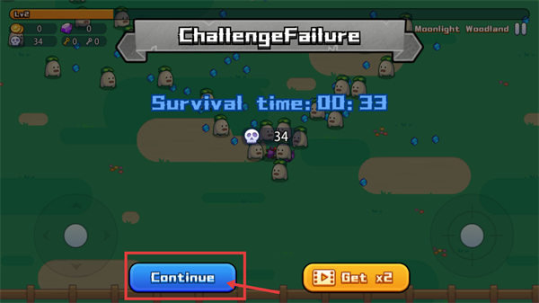 4、挑战失败后显示【ChallengeFailure】,点击被框选的【Continue】按钮,返回界面准备重新挑战该关卡。