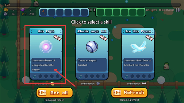 2、技能选择界面中,点击被框选的【Holy-Light】技能,该技能可召唤4道能量光束攻击敌人,提升战斗能力。