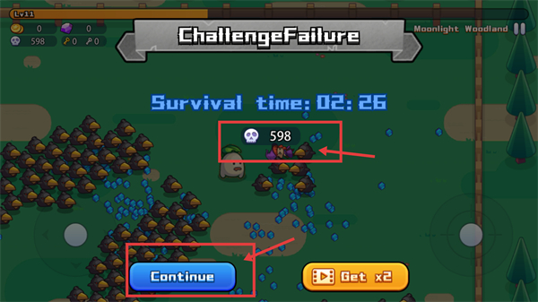 4、挑战后显示【ChallengeFailure】,击破数为598,点击被框选的【Continue】按钮,返回界面准备重新挑战。