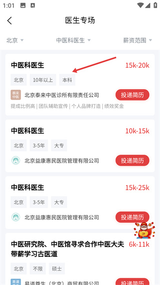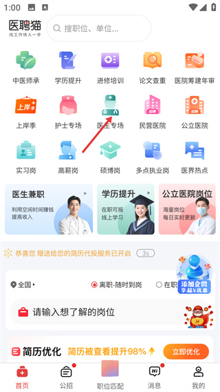 1、在医聘猫首页点击【医生专场】选项,进入医生类职位的专属列表页面,可查看各类医生岗位信息。