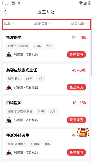 2、在医生专场页面通过“全国”“全部职位”等筛选栏,调整地区、职位类型等条件,精准筛选目标岗位。