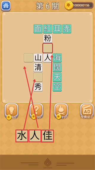 1、将【水】【人】【佳】填入对应空位,补全【山清水秀】【粉佳人】等成语,结合已有【面紅耳赤】【人山人海】完成关卡。