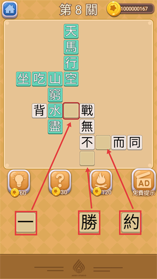 2、将【一】【勝】【約】填入空位,补全【背水一戰】【不約而同】等成语,结合已有【天馬行空】【坐吃山空】推进关卡进度。