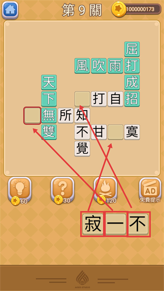 3、将【寂】【一】【不】填入对应位置,补全【天下無雙】【不甘寂寞】等成语,可借助【提示】功能完成本关的成语匹配。