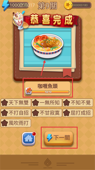 4、通关后,解锁【咖喱魚頭】美食,显示【恭喜完成】,点击【下一關】继续挑战,同时可查看已解锁的成语列表。