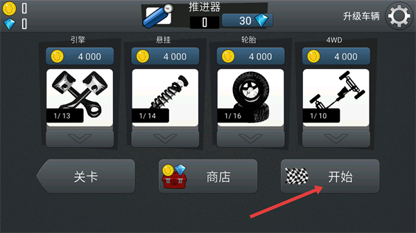 1、在车辆升级界面,可消耗金币升级【引擎】【悬挂】等部件,点击【开始】进入关卡。