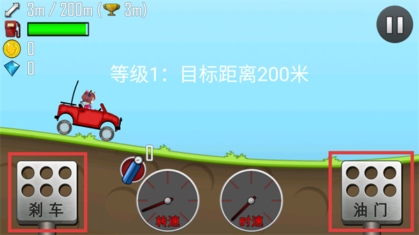 2、在关卡里,通过【油门】【刹车】按钮控制车辆行驶,观察转速与时速。