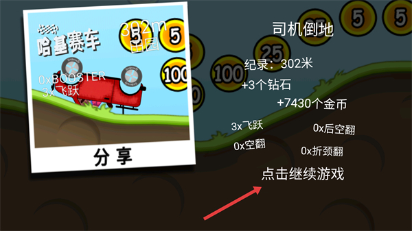 4、结算界面查看【302米-纪录】等数据,点击【点击继续游戏】开启下一轮挑战。