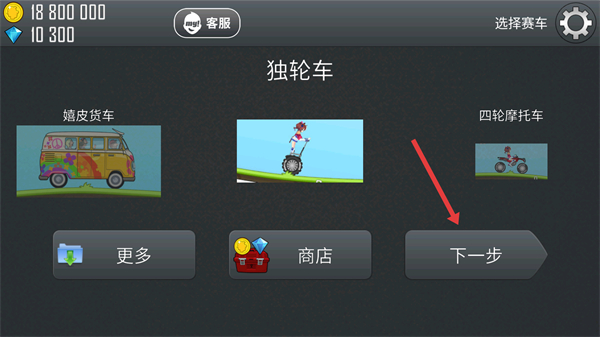 1、在选车界面选择【独轮车】,点击【下一步】进入关卡,也可通过【更多】查看其他车型。
