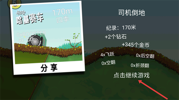4、结算界面查看【170米-纪录】等数据,点击【点击继续游戏】重新游玩。