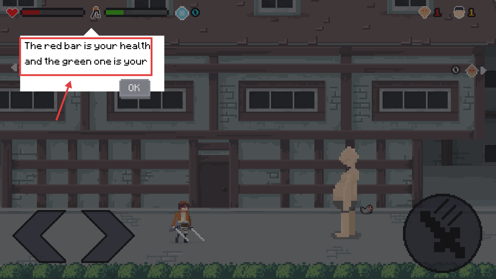 2、进入游戏后会弹出提示框,说明红色条为生命值绿色条为能量,点击【OK】关闭提示就能开始战斗。