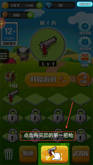1、进入游戏后,点击界面下方的【购买枪支】按钮获取第一把枪,这是开启战斗的关键步骤,为后续射击僵尸做准备。