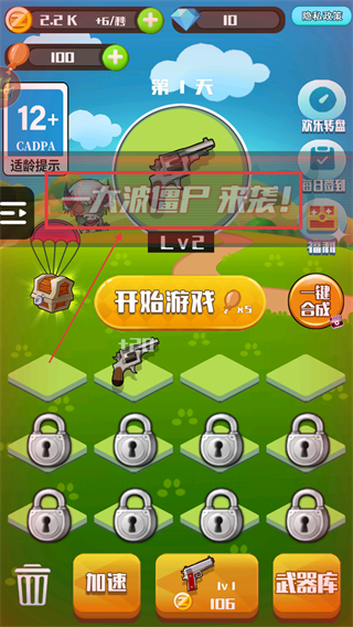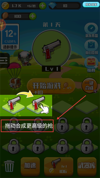 2、获得两把相同枪支后,拖动它们到一起进行合成,可升级为更高级的枪支,提升战斗能力,助力应对更强僵尸。