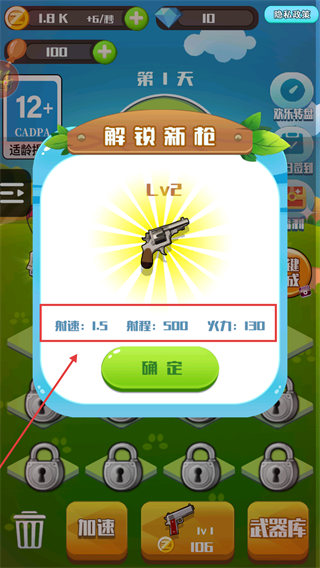 3、解锁新枪后,查看其【射速】-【射程】-【火力】等参数,了解性能后点击【确定】,以便更好地搭配战斗策略。