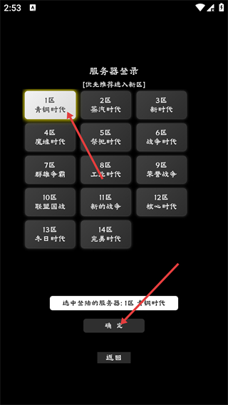 1、选择优先推荐的新区(如1区青铜时代),点击【确定】按钮完成登录,新服通常资源竞争较小,更适合新手起步。