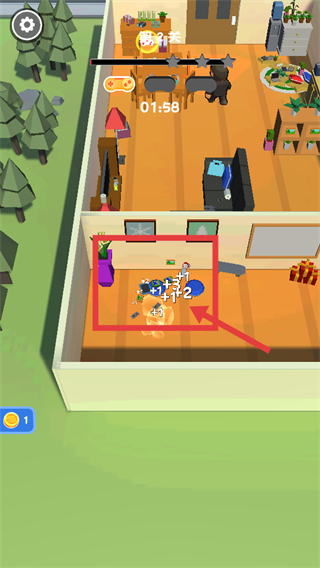 1、第2关界面中,收集被框选区域的道具,获得+1、+2等积分加成,当前笑脸值为1,倒计时01:58,推进收集进度。