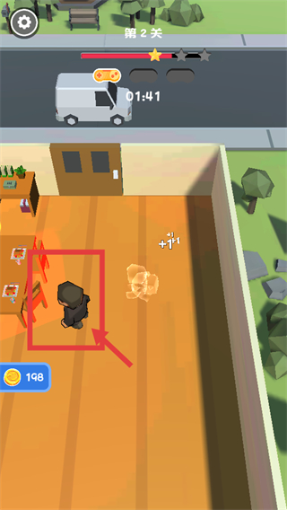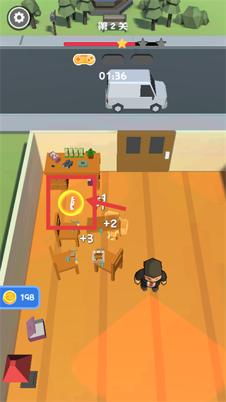 2、要小心不要靠近被框选的角色,继续收集场景内的道具,笑脸值提升至198,倒计时01:41,积累资源解锁关卡内容。