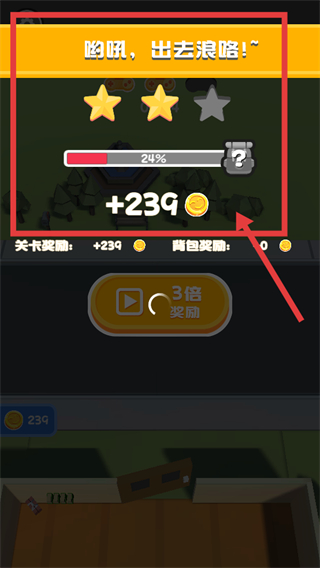 4、关卡完成后显示“呦吼,出去浪咯!”,获得2颗星与+239笑脸值奖励,可选择“3倍奖励”或结算,完成第2关挑战。