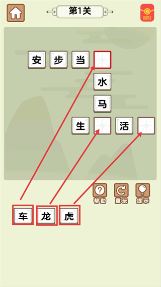 2、第1关中,将【车】【龙】【虎】填入对应空位,补全【安步当车】【生龙活虎】等成语,可借助【提示】功能推进匹配。