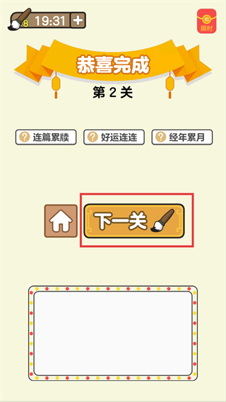 4、完成第2关后显示【恭喜完成】,解锁【连篇累牍】等成语,点击【下一关】进入后续关卡,继续推进升官进度。