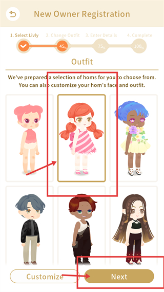 3、在“Outfit”环节,选定被框选的装扮,点击【Next】按钮,完成装扮选择,推进至信息填写环节。