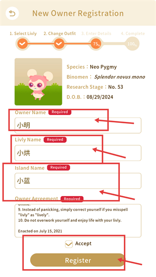 4、在“Enter-Details”环节,填写被框选的名称信息,勾选【Accept】后点击【Register】,完成新角色创建流程。