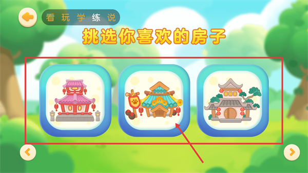 1、在【看玩学练说】界面,参与【挑选你喜欢的房子】环节,从三个房子选项里选任意一个,完成该选择,推进游戏的流程。